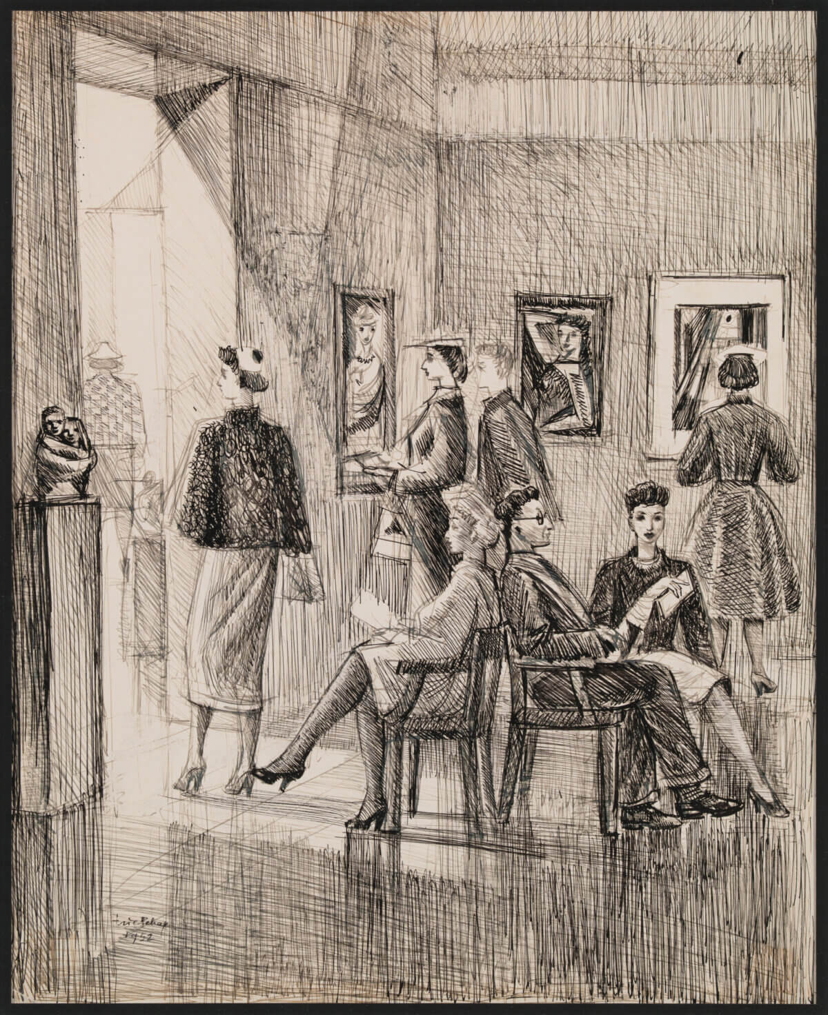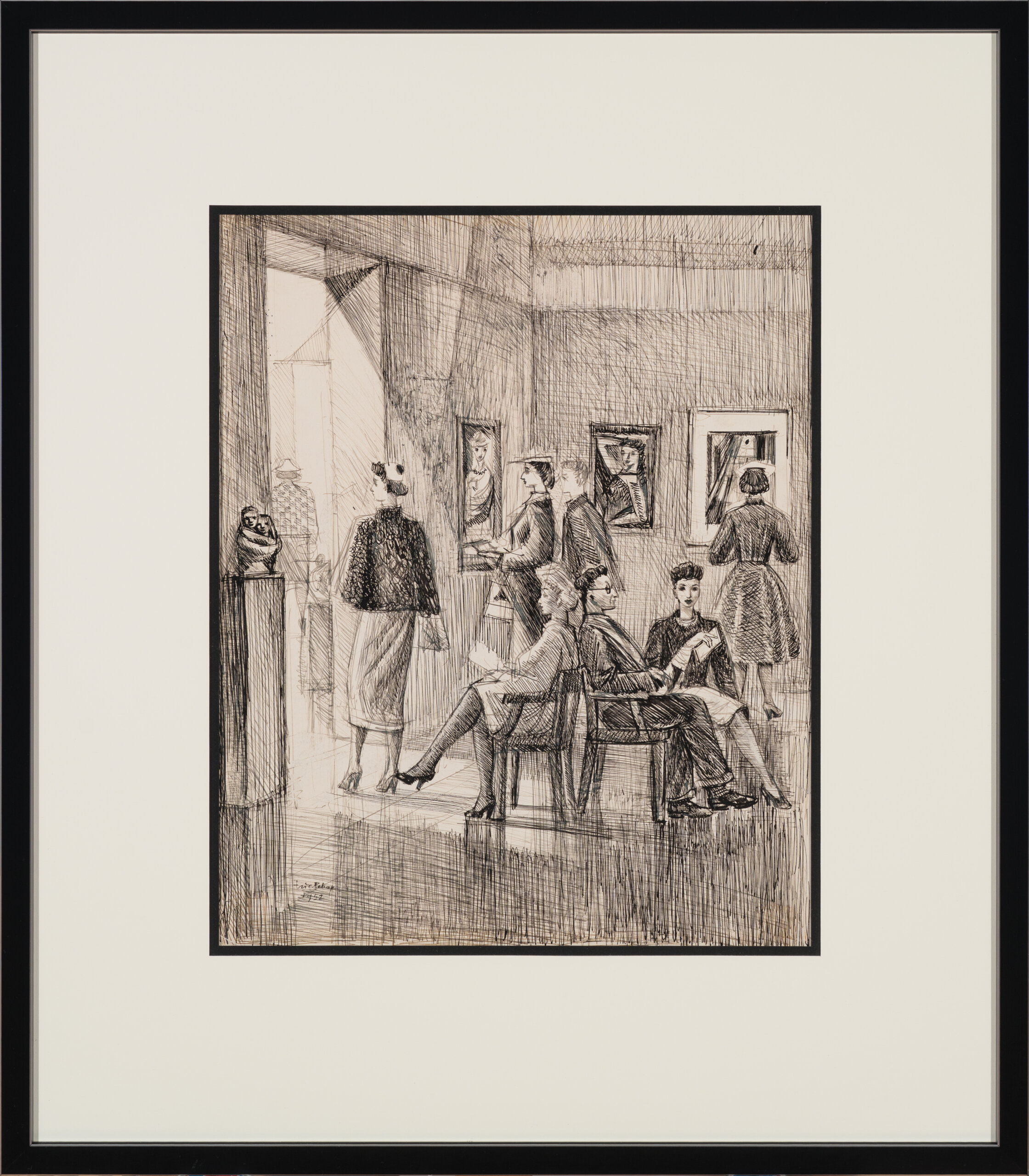 Vaade kunstinäituselt on stiilne sissevaade 1952. aasta kunstiellu. Pehapi tähelepanu on šikilt riietatud publikul, kes igaüks omal moel kunsti üle arutlemas – kas omaette või paarilisega. Teiselt poolt annab Pehap edasi modernistlikke poolabstraktseid kunstiteoseid, nii skulptuure kui suuremõõtmelist maali nende taga. Kolmandaks läbib kogu galeriiruumi kujutust geomeetriline stilisatsioon, muutes ruumi mänglevalt mitmemõõtmeliseks. Sama stseen inspireeris teda sama teemat kujutama ka õlis, kui 1955. aastal valmis samanimeline õlimaal.