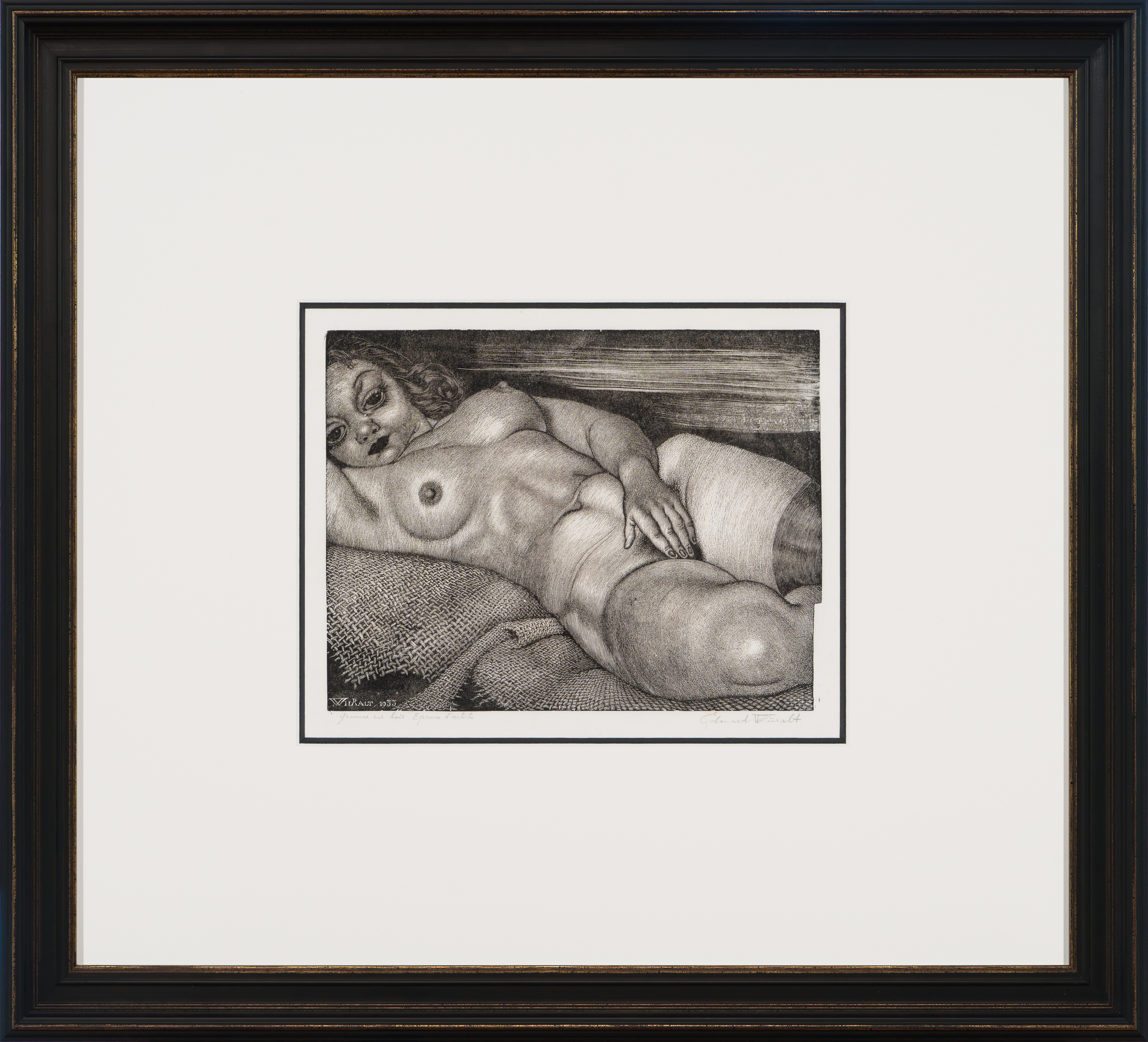 Eduard Wiiralti (1898-1954) üleminekuperioodil, kus tormakas ja fantaasiarikas pahede kujutamise ajastu astub väikse sammu rahulikuma, harmoonilisema elu poole, valmisid teosed, mis kandsid endas jooni mõlemast ajast. Nõnda leiame teosel “Lamav akt kanepiriidel” nii koreda koega kotiriide kui õrnade joontega naisolevuse, mis üksteise vastandlikkust komplementeerivad. Ühelt poolt rahulik lamav poos, teisalt meelad mõtted ja kutsuv pilk, mis annavad aimu Wiiralti enda uutest otsingutest.