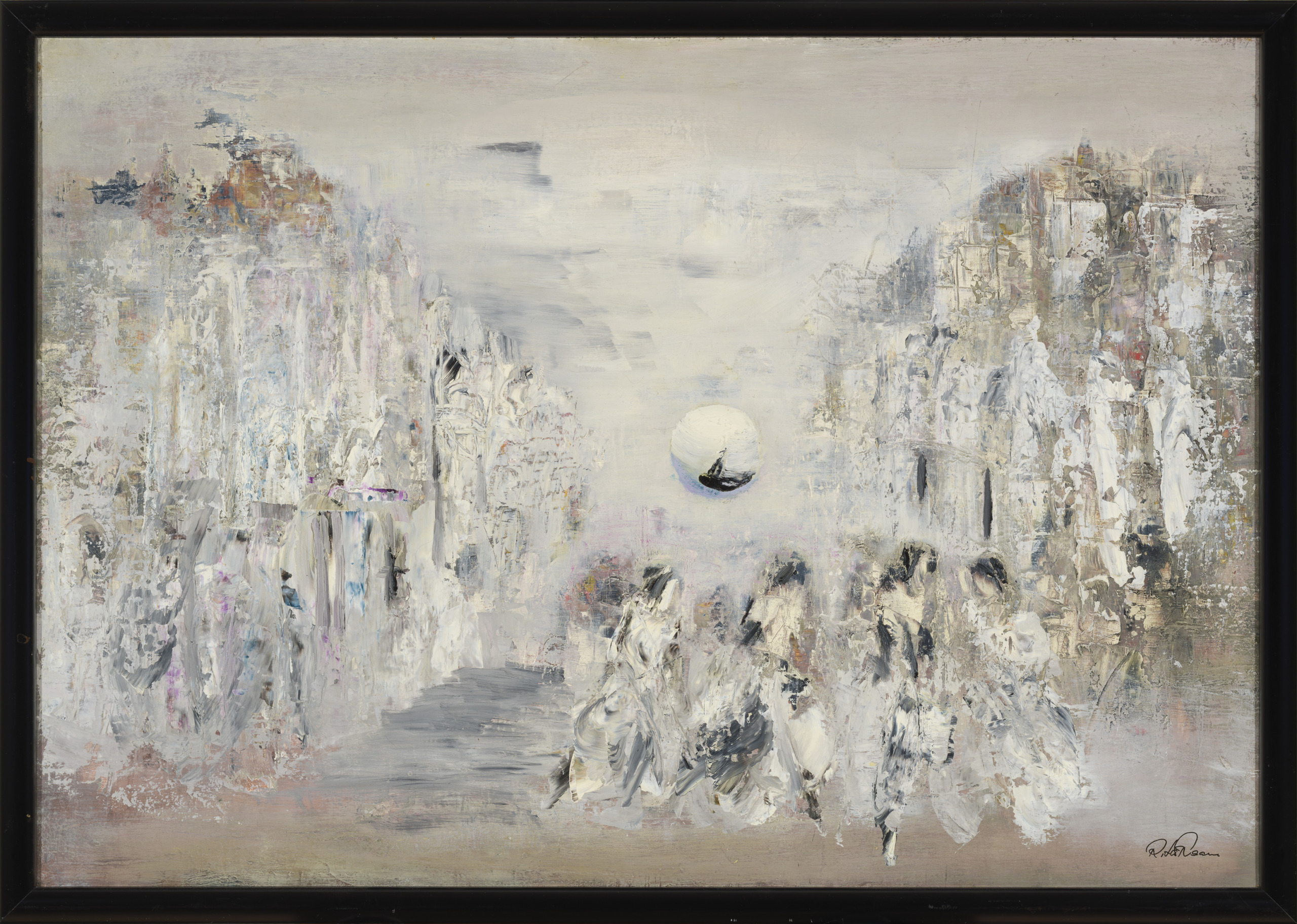 Peaaegu monokroomse koloriidiga maalil tegeleb Raave peamiselt abstraktse kompositsiooni lahendamisega, vaimseteks eeskujudeks Jaan Elken ja Enn Põldroos. Vertikaalsete värvilaamade rütm annab teosele dünaamilise ilme, pilt tervikuna meenutab aga fantastilist maastikku a la Max Ernst, mille esiplaanil kiirustavad kuhugi neli figuuri, sulandudes samas vahetult maali üldtonaalsusse.