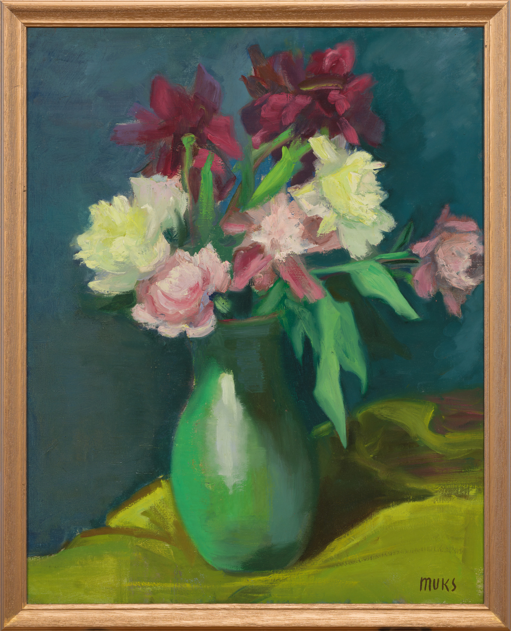 Meie ees oleval maalil sätib Muks õied tumerohelisse savikannu nii loomulikus asendis, et jääb mulje justkui oleks need iseenesest perfektsesse kompositsiooni vajunud. Siin pole pingutatult ühepikkuseks lõigatud varsi, vaid pojengid on esitletud täpselt sellisena nagu loodus on neid loonud. Kunstnik tabab täpselt värskete õite täidlaselt mahlakad värvitoonid – karmiinpunase, kreemjasvalge ja puuderroosa, millest viimasesse segab hõrku maasikavahtu. On näha, et kunstnik naudib loomise protsessi täiel rinnal.