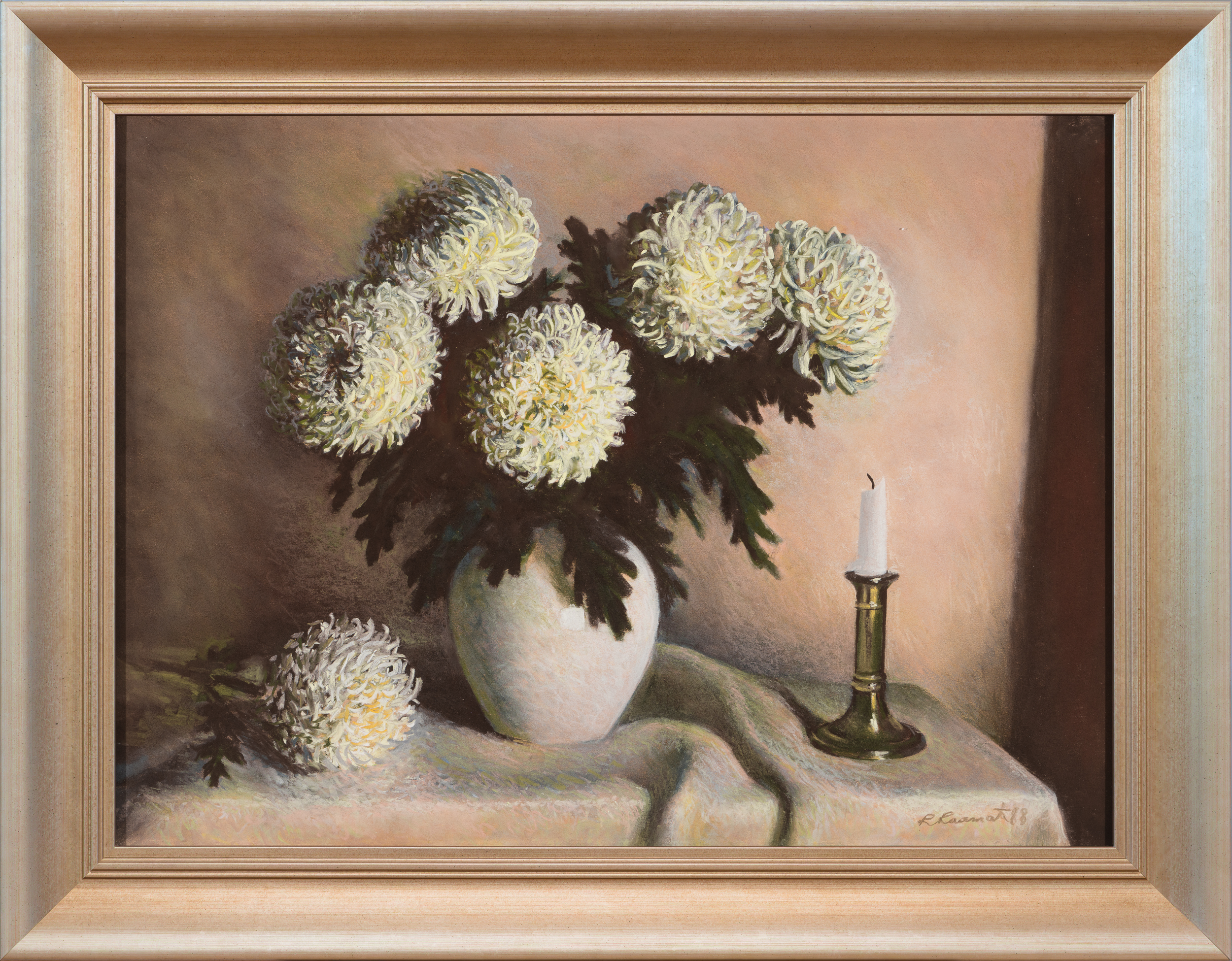 Realistlik detailipeenus, ajahetke tundelise peatamise oskus ja teatud müstilisus iseloomustavad tema “Krüsanteeme” kui ajatut jäädvustust floristlikust ilust. Maali mitmetähenduslikkust rõhutab, et sümbolistikas tähistavad valged krüsanteemid ausust ja truudust, pooleli põlenud küünal aga assotsieerub ajalikkusega. Omaette vaatamisväärne on Raamatu vanameisterlikkus materjali ehedal kujutamisel (laudlina, vaas, pronksist küünlajalg).
