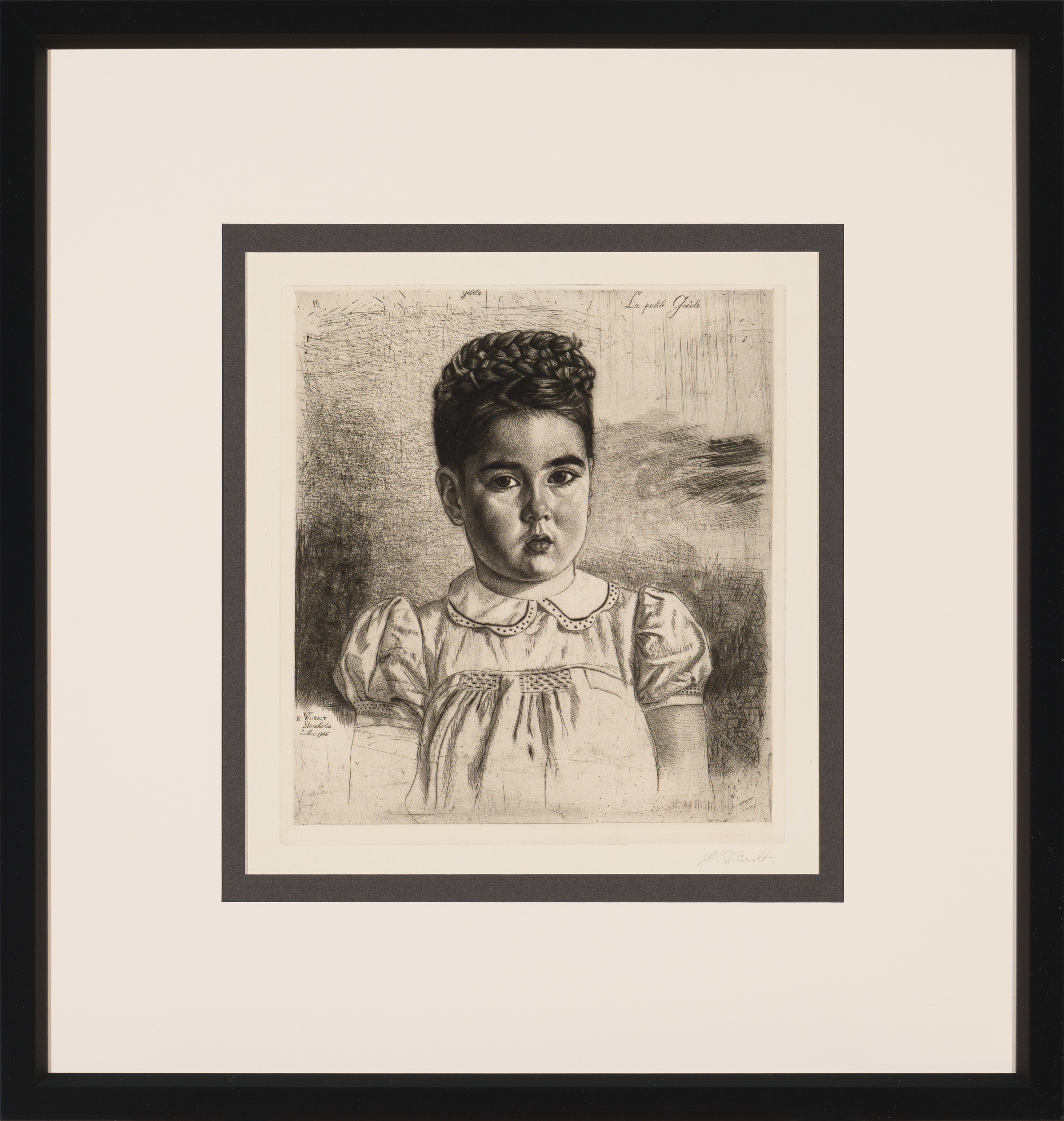 1946. aastal sai Prantsusmaaga jätkuvalt sidemeid hoidev kunstnik tellimuse France Presse’i esindajalt Stockholmis, kes vaimustatuna Wiiralti graveerimisoskusest tellis temalt oma kuueaastase tütre Gisèle’i Hervieu portree. 4. aprillil alustas Wiiralt portree graveerimist ning veidi vähem kui kolme nädala pärast sai ta tõmmata esimesest seisundist tõmmised. Gisele´i rahulik ilme oli justkui idüllilise Rootsi elu vastupeegeldus, mis aitas Wiiraltil ärevust tagasi tasakaalu saada peale Eestis ja Saksamaal kogetud pommitamisi ja varemetemerd. Tüdruku sametised tumedad silmad, mis tulenesid tema indohiina päritolust, aitasid kaasa ilmeka ja mõjuvõimsa portree loomisele.