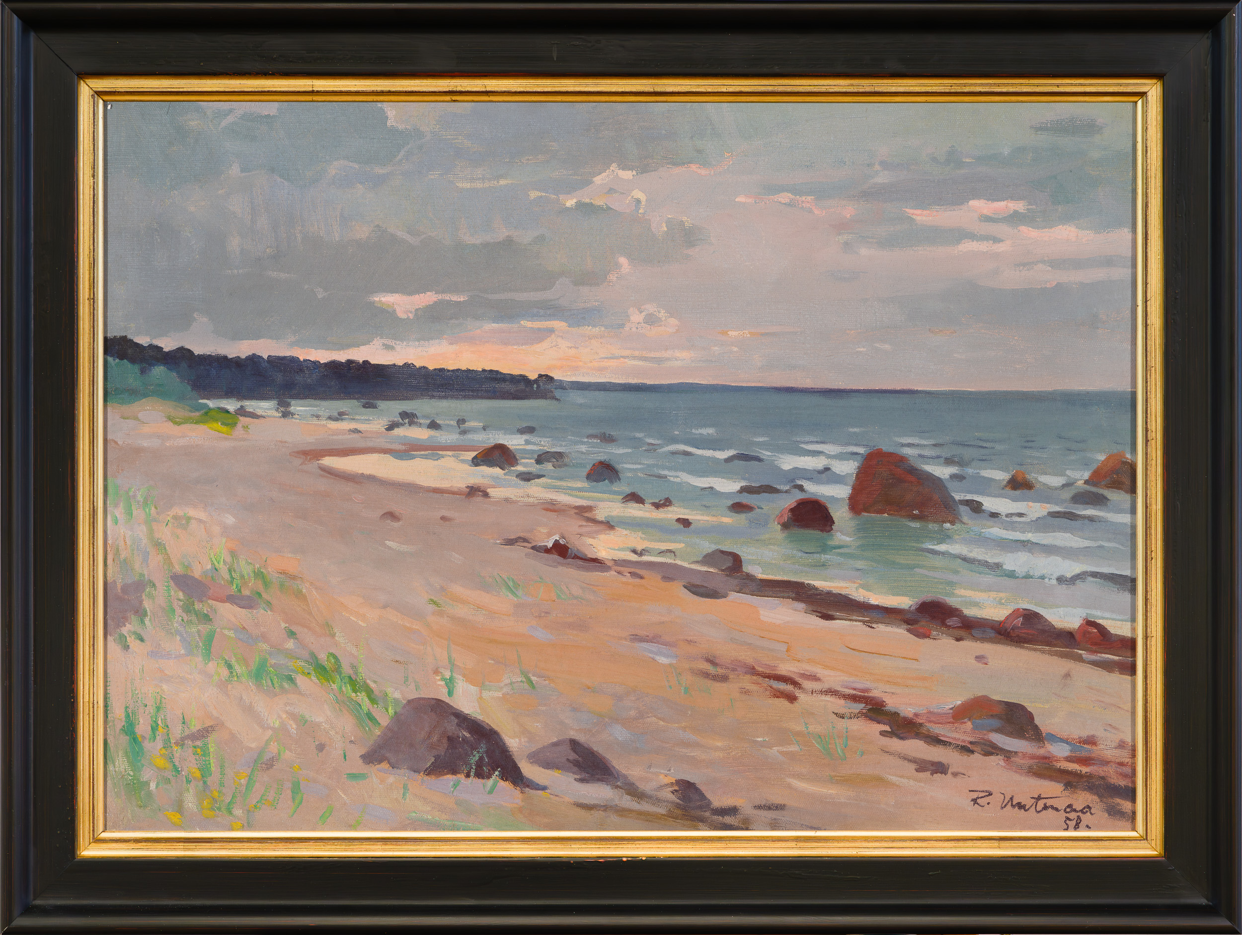 Käesolevas teoses valitseb aga õhtune rahu. Just see lühike viiv, mil päike veel oma veripuna ei näita, ent annab juba oma õrnalt puuderja kumaga aimu lähenevast ööst. Rutja rand, mis asus Uutmaa kodukülast Eismast vaid lühikese jalgrattasõidu kaugusel, võlus oma pehme liivase ranna ning vaikusega. Kunstnik on valinud kaadri selliselt, et ta enda kodukoht jääb taamal silmapiirile, lisades teosele isiklikult olulise tähenduse.