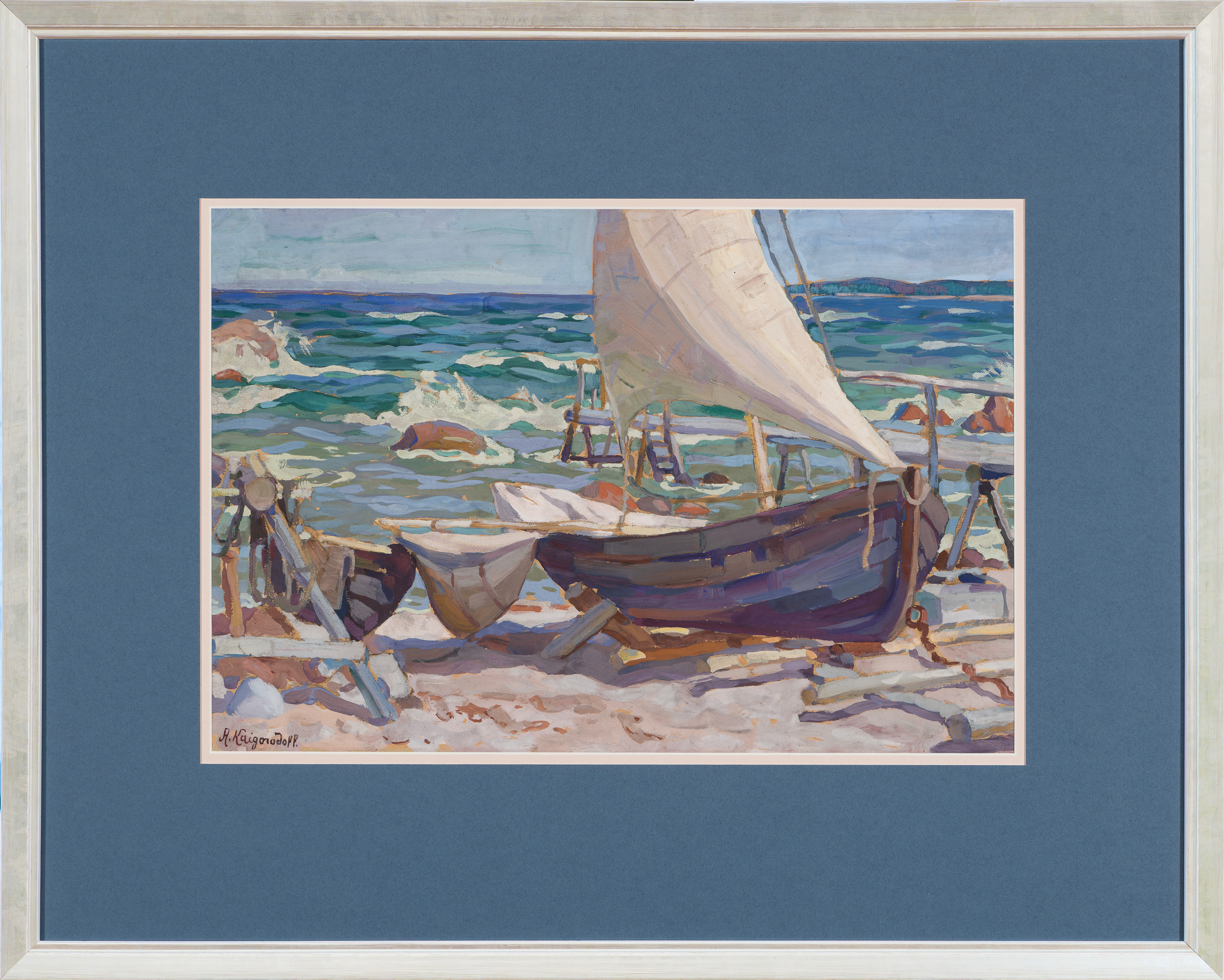 Kaigorodov armastas eriti maalida põhjaranniku motiive – siin elasid tal tuttavad, mis andis talle võimaluse jääda öömajale ning pikemalt nautida rannaelu võlusid. Käesolev maal paelub säravas valguses puhtalt kõlavate värvidega ja tuulise ranna atmosfääri otse tajutavalt edasiandva pintslikäsitlusega. Meisterlik teostus!
