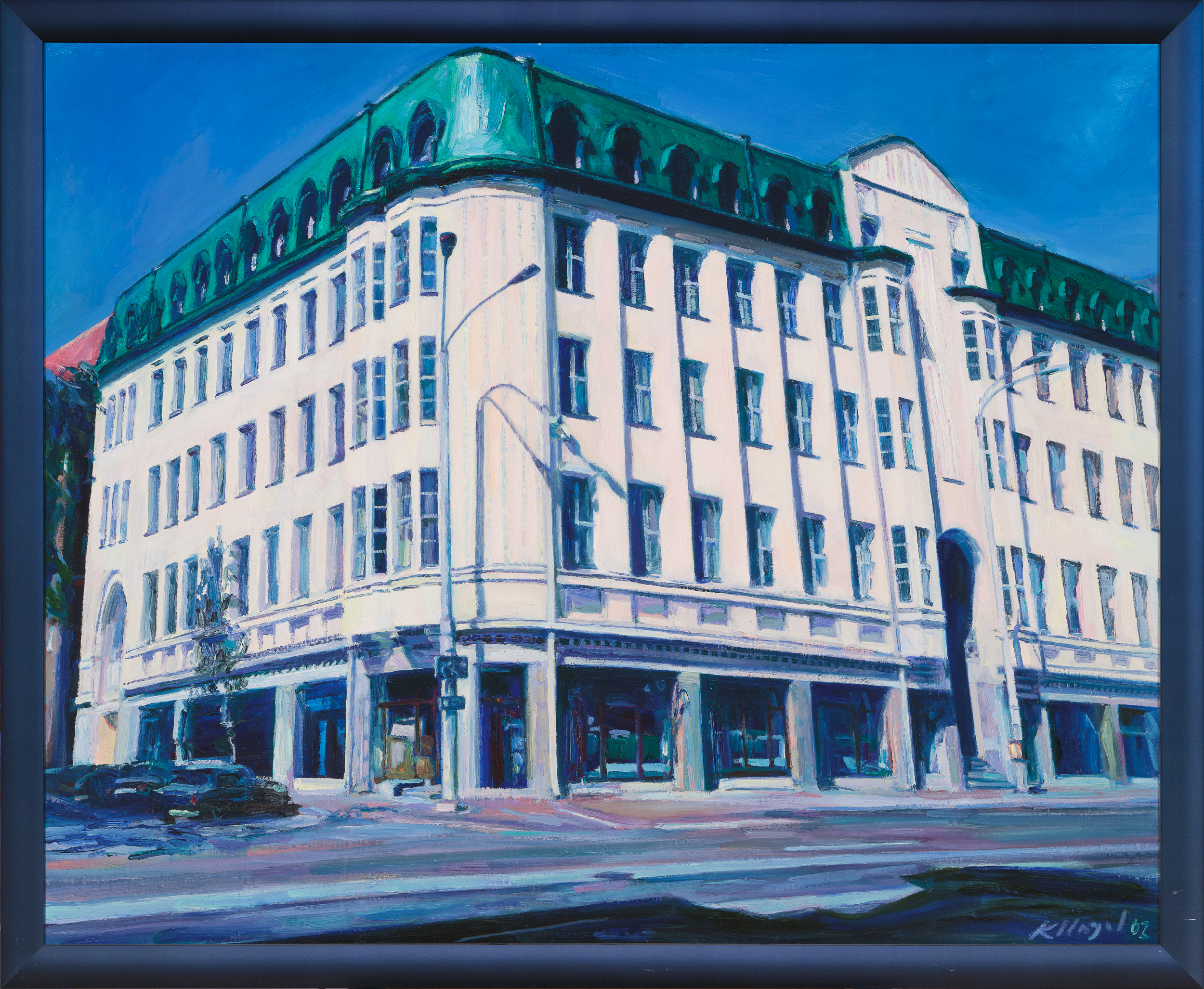Eesti Kunstiakadeemia 1999. aastal maalijana lõpetanud Karl Kristjan Nageli (s 1977) ekspressionistliku loomingu taustal on käesolev teos erandlik. Fotorealistlikult maalituna jätab nurgaperspektiivist nähtud kuulsa Soome arhitekti Eliel Saarineni projekteeritud hoone monumentaalse mulje. Nii on see Tallinna juugendarhitektuuri vapihoone inimtühjal tänaval kui eraldiseisev portree ühest pealinna sümbolist kui asjast iseeneses ja noore maalija tehniliste võimete võimas demonstratsioon.