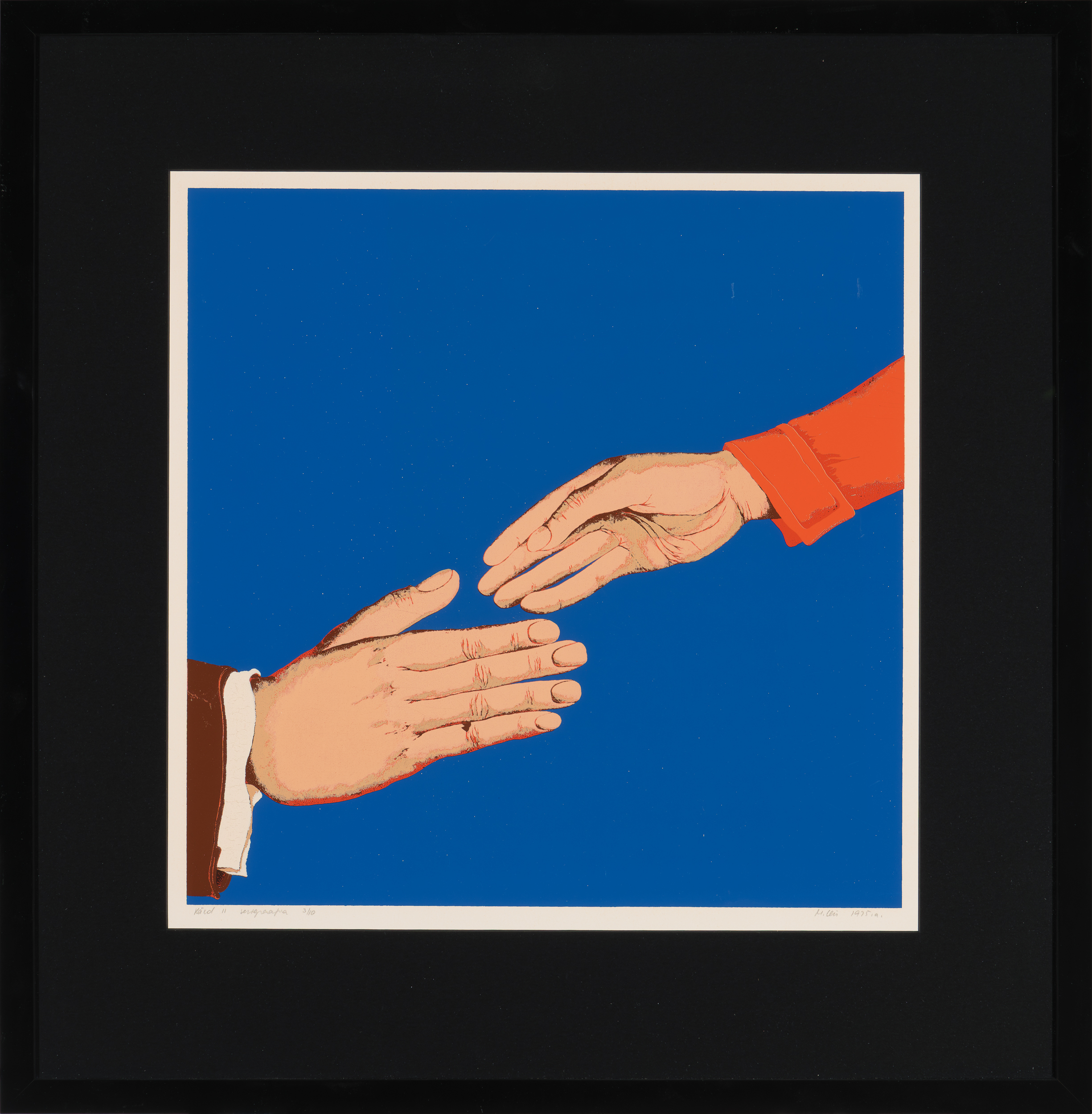 Just kahe kohtuva käe kujundil põhineb tema kuulus serigraafia “Käed”, kus Leis jagab pildipinna kaheks. Psühholoogilise pinge loob ta läbi kahe vastandliku suunaga kehaosa, mis kohtuvad erksinise fooni taustal, kuid ometigi ei puutu üksteist. See „peaaegu-puudutus“ tekitab vaatajas võimsa emotsionaalse ja ruumilise energia. Käised omakorda – üks tumepruun ja maskuliinne, teine erepunane ja naiselik – jutustavad soolistest rollidest ja nende omavahelisest võrdsusest.