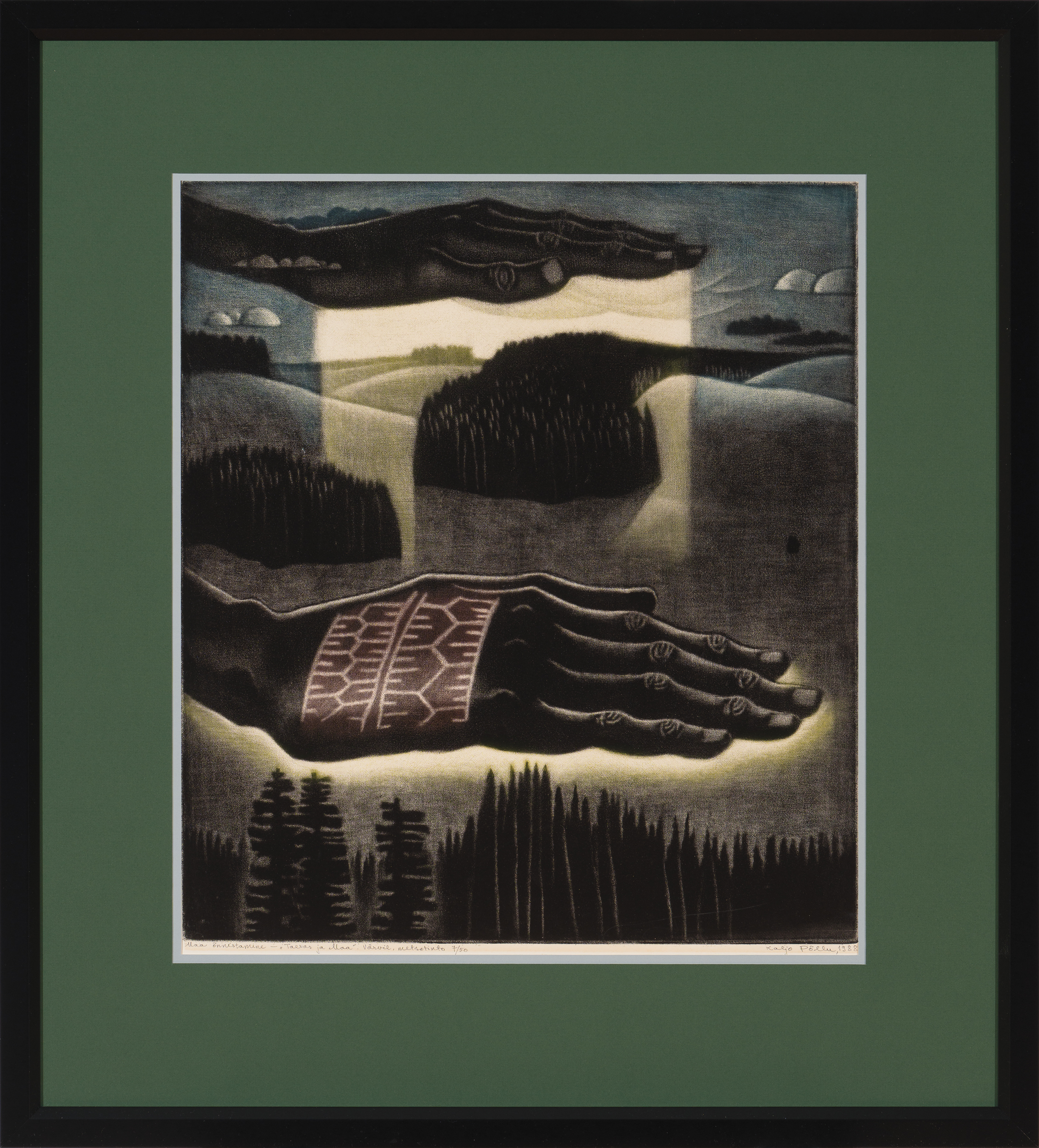 Nii ka võimsas teoses „Maa õnnistamine“, kus Põllu ühendab maastiku ja inimkäed üheks sümboolseks tervikuks. Justkui taevas hõljuvate pilvedena mõjuvad käed katavad maastikku, luues kujundi, mis kannab üheaegselt nii kaitse kui ka loomise tähendust. Metsotinto sume valgus annab teosele ruumilise, peaaegu kosmilise mõõtme võimendades veelgi maa õnnistamise hetke püha ja ajatut kandvust.