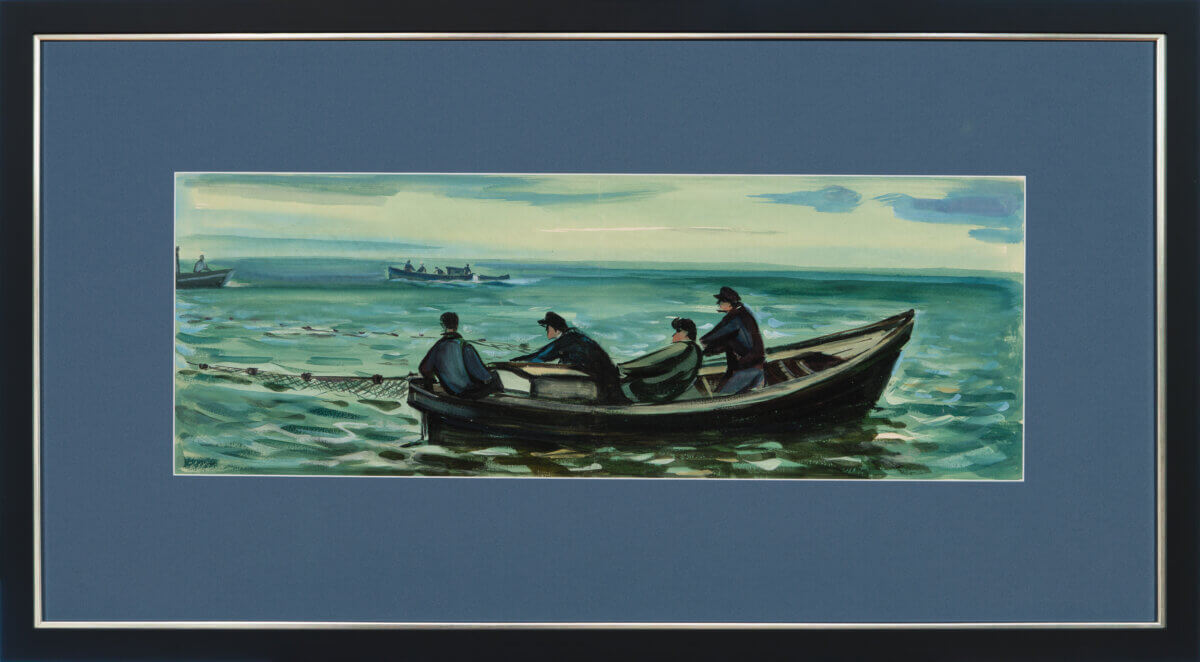 Pirgi merevaated on koloristlikud vaatemängud ja nii ka käesoleva teose puhul, kus ta tõestab end toonmaali virtuoosse valdajana – sisuliselt ühe värviga loob ta tervikliku jutustuse paatkondadest, kes parajasti kalaretkele asumas.