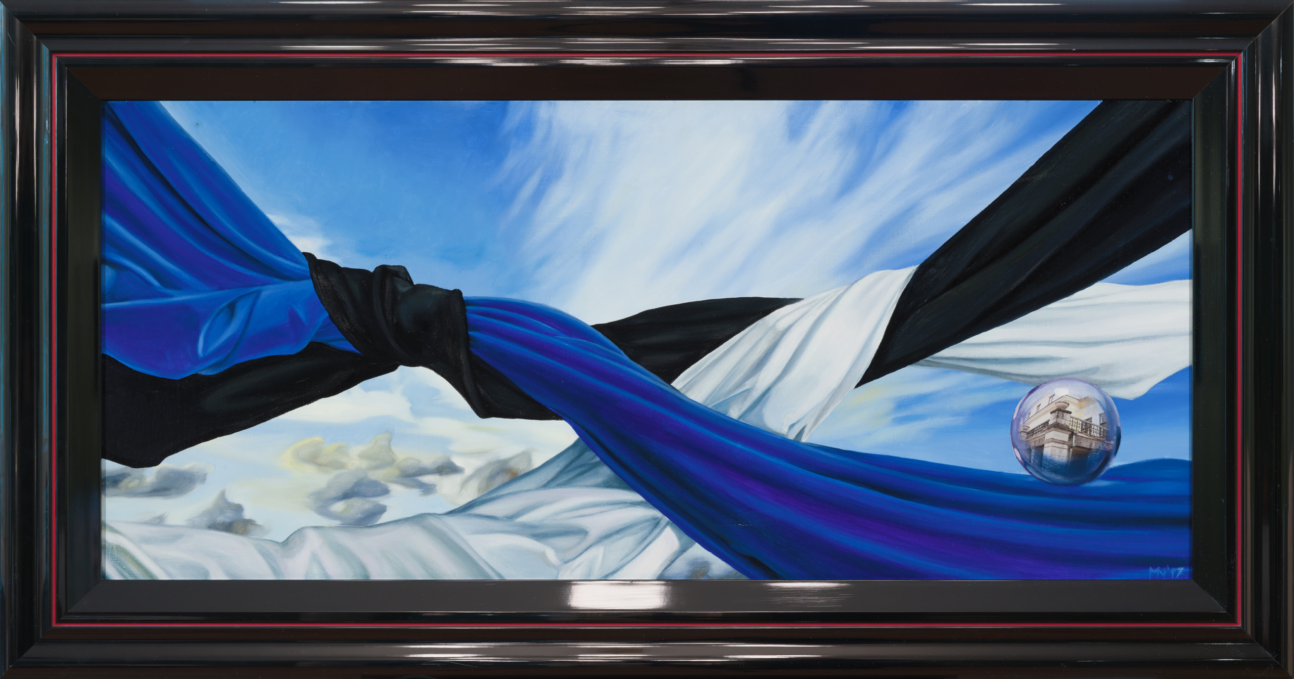 Teos „Vaikelu Eesti ilmaga II – Vana-Vigala“ on üles ehitatud omavahel sundimatult põimuvatele kangastele – sinisele, mustale ja valgele –, mis ei viita pelgalt trikoloorile, vaid moodustavad voolava, peaaegu abstraktse maastiku. Pildile maalitud klaaskuul, milles peegeldub klassitsistlik Vana-Vigala mõisahoone, toimib optilise fookuspunktina, mis koondab ajaloolise mälu ja arhitektuuripärandi üheks tabamatuks, kuid täpseks hetkeks.