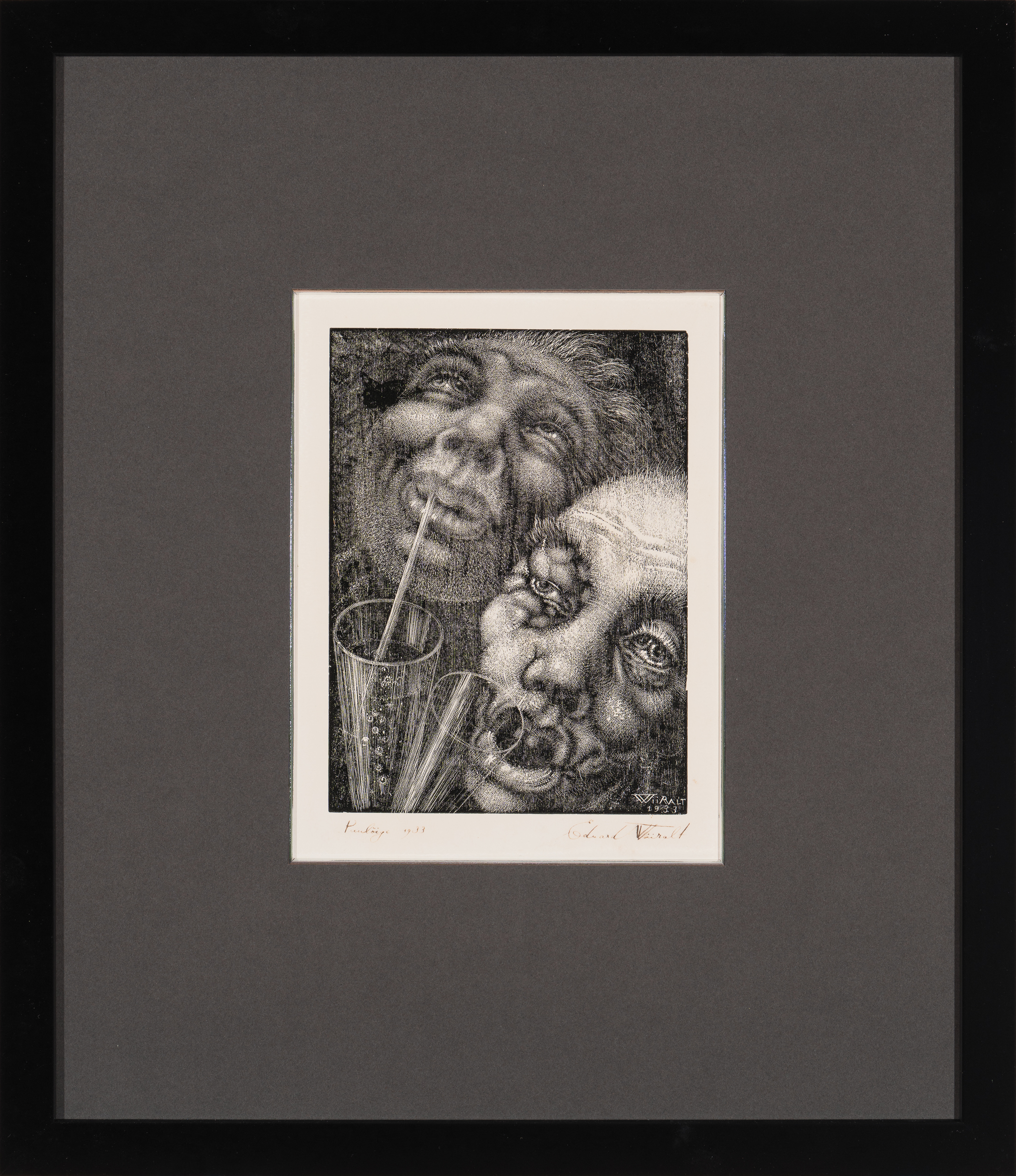 Eduard Wiiralti (1898-1954) üks tuntumaid teoseid „Absindijoojad“ on valminud vahetult enne loomingulist pööret ning on seega märgiliseks hüvastijätuteoseks „tormi ja tungi“ perioodile. Wiiralti ekspert ja monograafia autor Mai Levin on teose peategelasi tabavalt nimetanud „kahestunud silmateradega tüüpideks“, kes mõnuainet joovastunult kõrrega suhu tõmmates seda tehes ühtlasi teispoolsust endasse ahmivad. Nii sünnib topeltreaalsus, paralleelmaailm, mille taha elumurede eest peituda, piirideta lõbutseda ning anduda oma salajaisematele fantaasiatele. Tundliku käega graafik näitab siin meisterlikkust puugravüürist maksimumi võtmises ning oskust ka kõige pahelisemaid emotsioone empaatiliselt käsitleda.