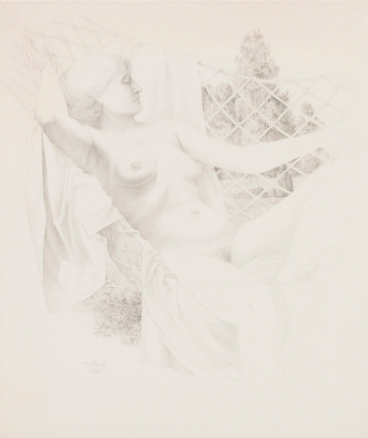 Suvise aeglaselt kulgeva idülli allegooriana sobib võrkkiiges poseeriv naine teemasse nagu rusikas silmaauku ja Henno Arrak (1930-2017) pole jätnud juhust kasutamata. Väga hea joonistajana demonstreerib kunstnik nii oma perfektset viirutustehnikat kui ka esteetilist maitset – ta ei välju kompositsioonis hea maitse piiridest.