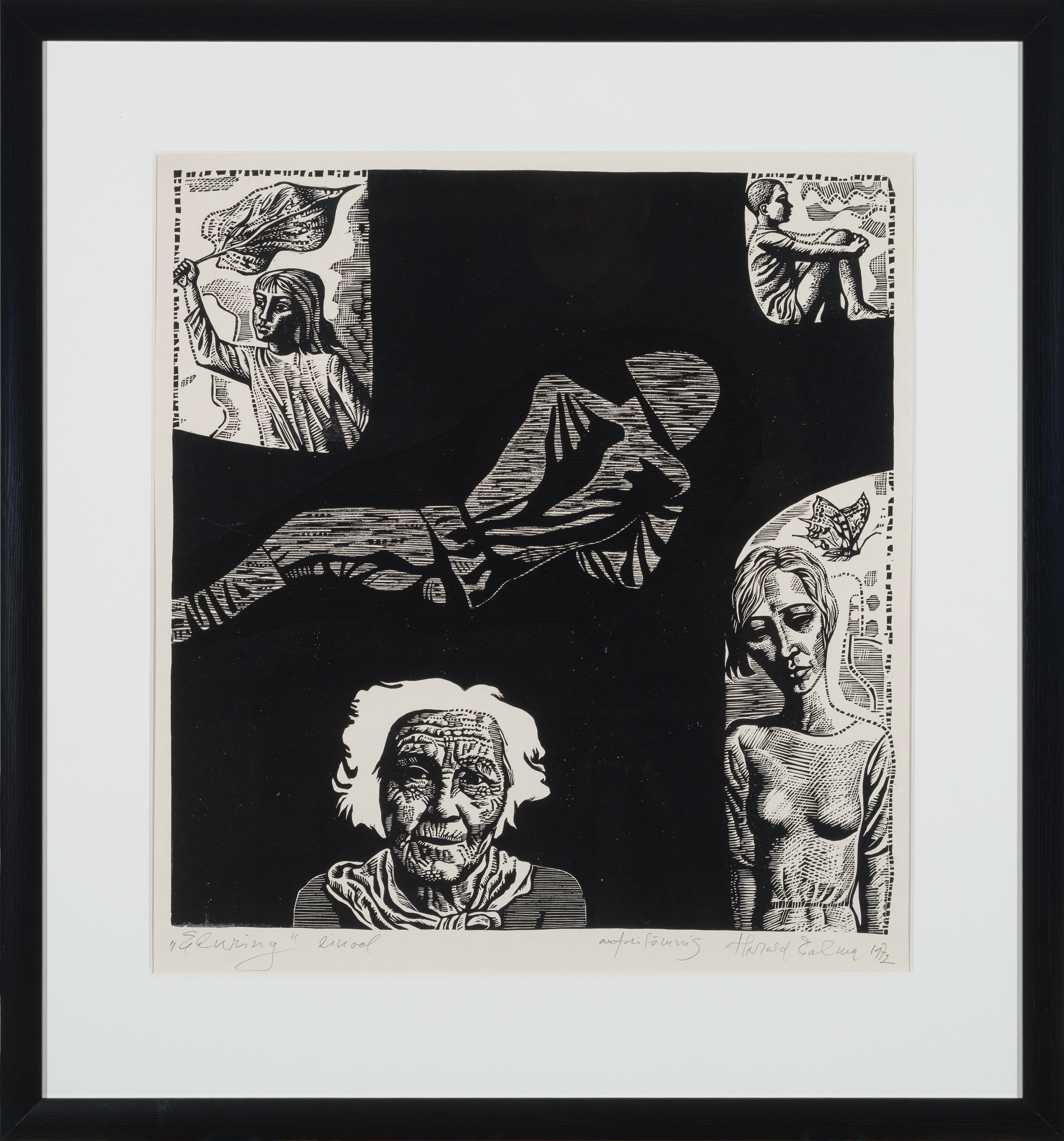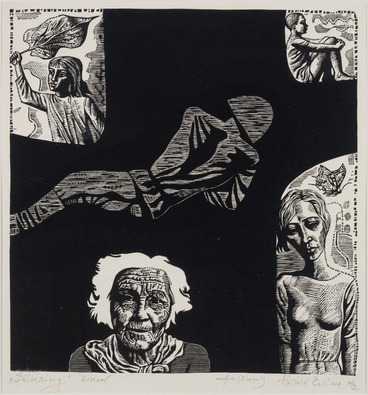Herald Eelma (s 1934) tööstiil on põhjalik; ta on virtuoosne joonistaja, kes eksponeeris 1970. aastate keskpaigast alates näitustel keerukaid joonistusi, mis põimisid loodusmotiive ja inimesi omapärasteks kompositsioonideks. Sel ajal otsis ta linoollõike kõrvale varjundirikkamat ja suuremat detailitäpsust võimaldavat väljendusviisi. Seejuures on ta oma loomingus olulise etapina nimetanud just 1970. aastat, mil toimus tema näitus Eesti Kunstimuusemis  (koos Peeter Ulasega), valmis Eelma kuulus linoollõige “Kodumaa” (variatsioon käesolevast autoritõmmisest) ning aasta varem oli sündinud legendaarne “Tüdrukud”.