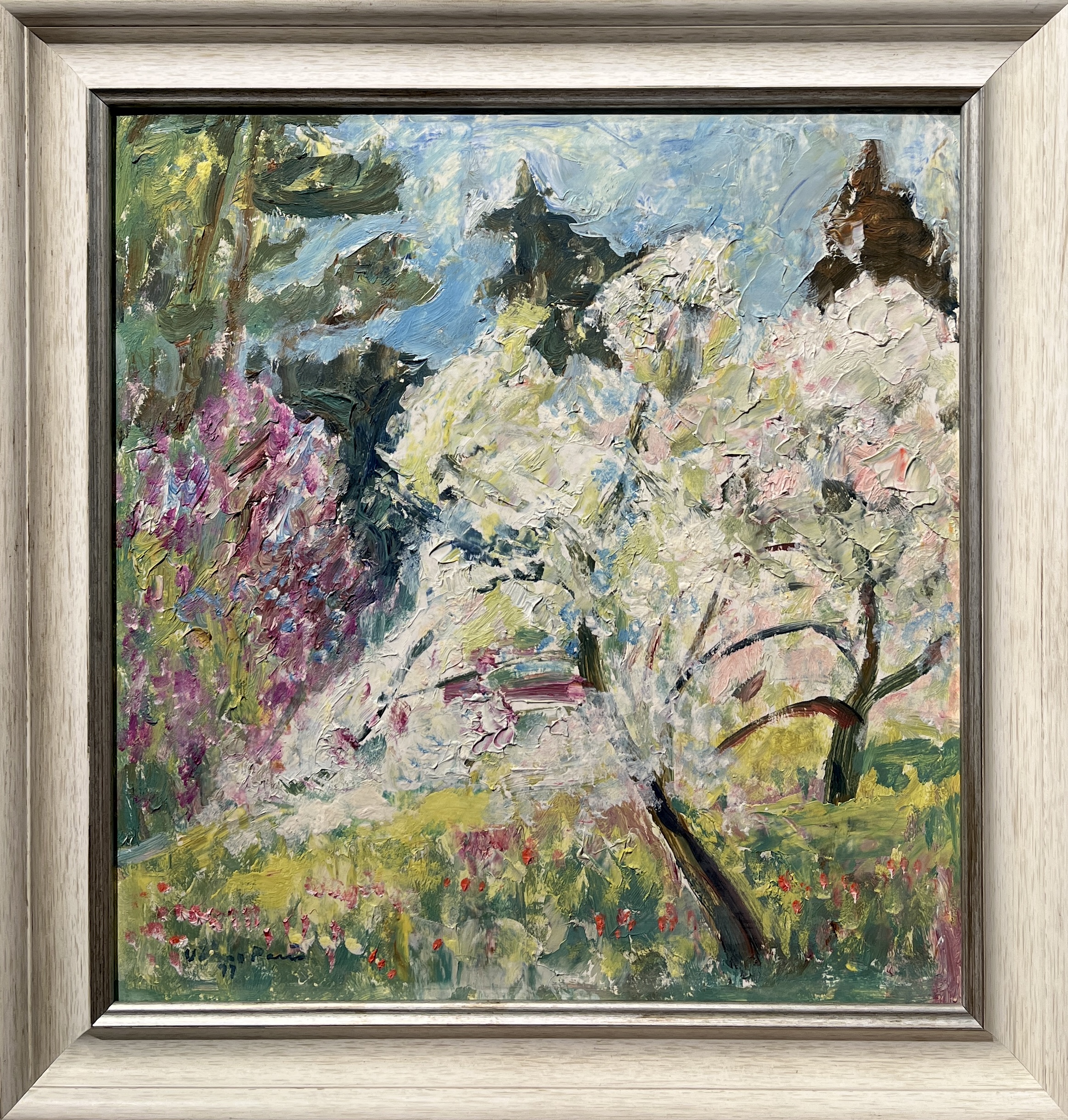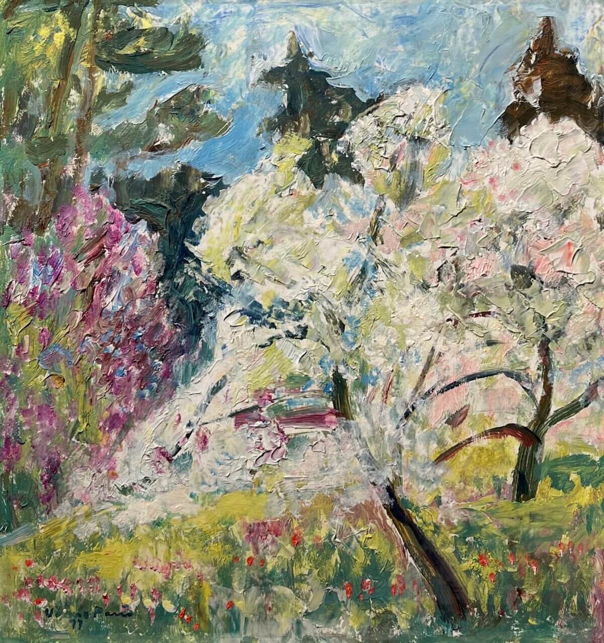 Tartus kunstnike perre sündinud ning Tallinnas kunstihariduse omandanud Väino Parise (1921-2001) lopsakas pintslitöö leidis koha nii tema maastikel kui lillemaalidel. Käesoleval teosel särab lopsakas õievahus kümblev õunapuu.